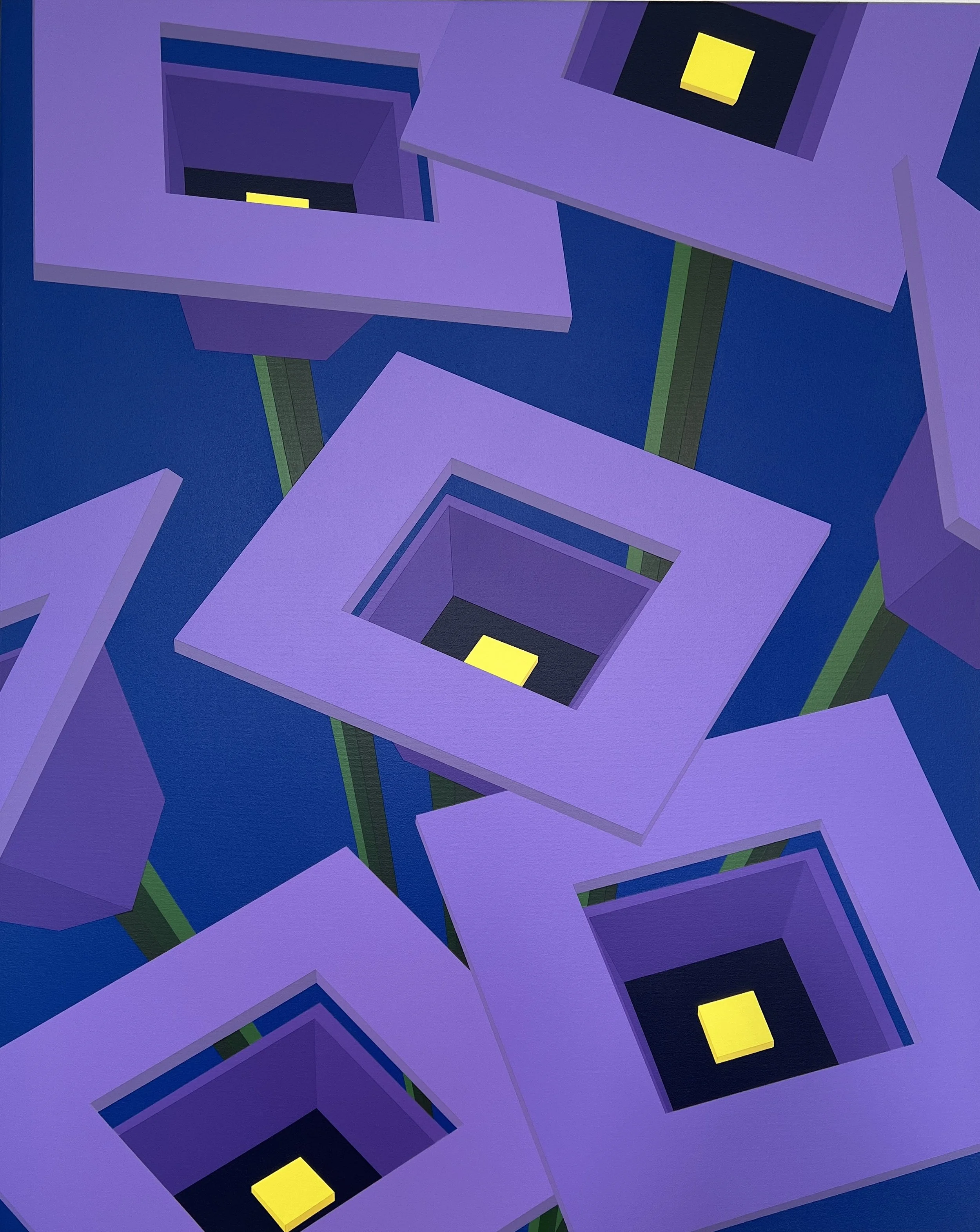 A Violets’ Fall is a downward bloom, violets leaning softly into space, each held by the familiar four-square system, yet rendered in cooler tones, on a deeper blue field. The feeling is quieter. More internal. Like a breath exhaled.