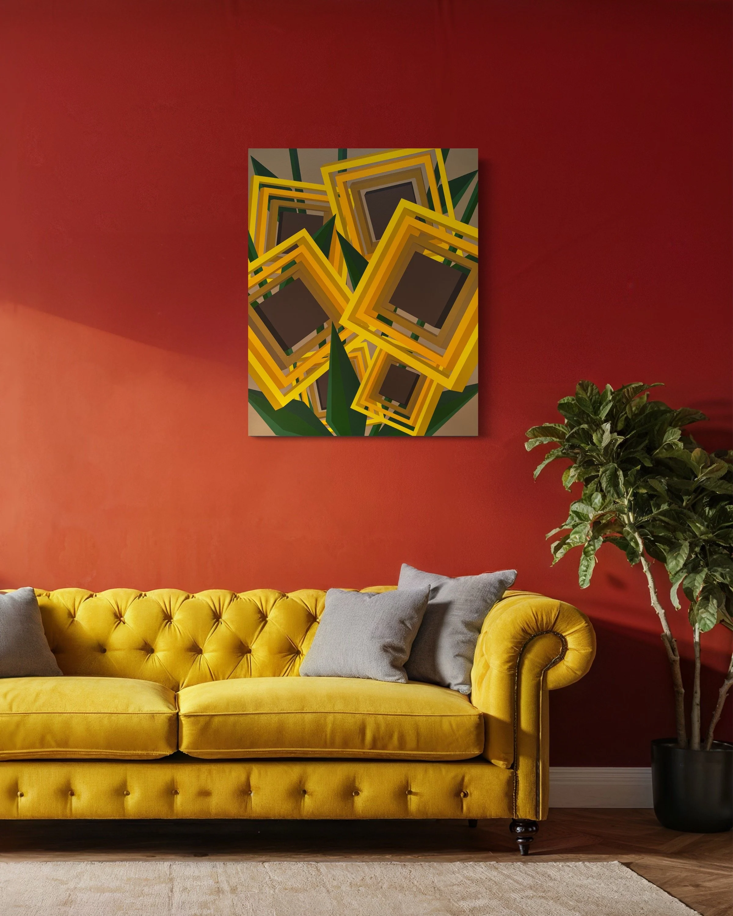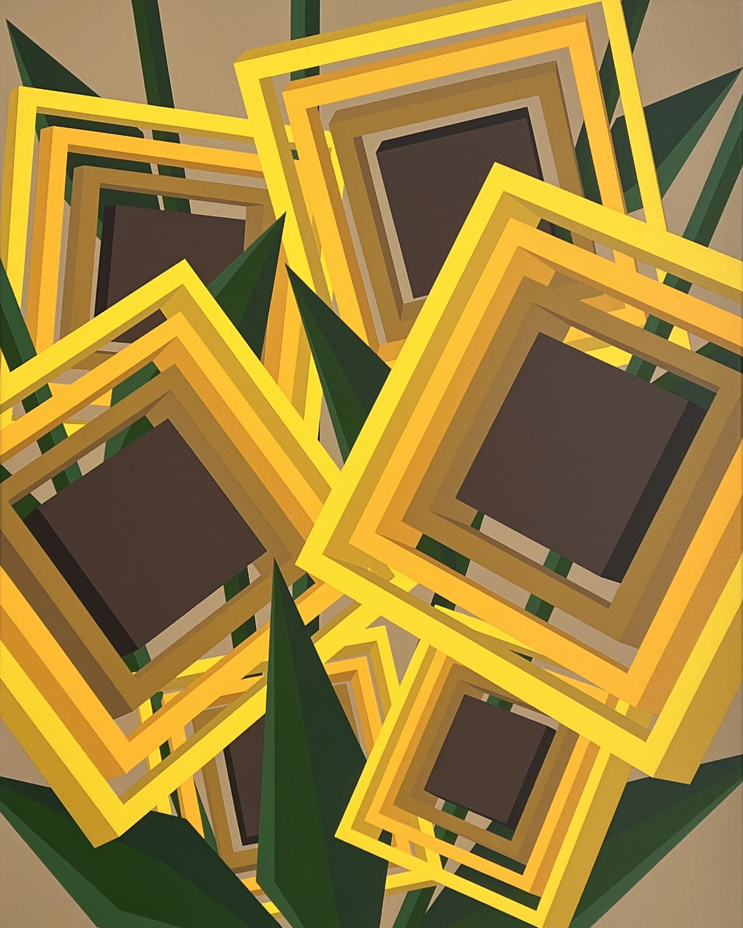 In Unique Forms of Sunflowers in Space, the Quadriflower system expands, literally. The blooms tilt, multiply, and collide across the canvas. Perspective is introduced. Depth is fractured. What was once flat becomes sculptural. The sunflower is no longer contained, it moves.